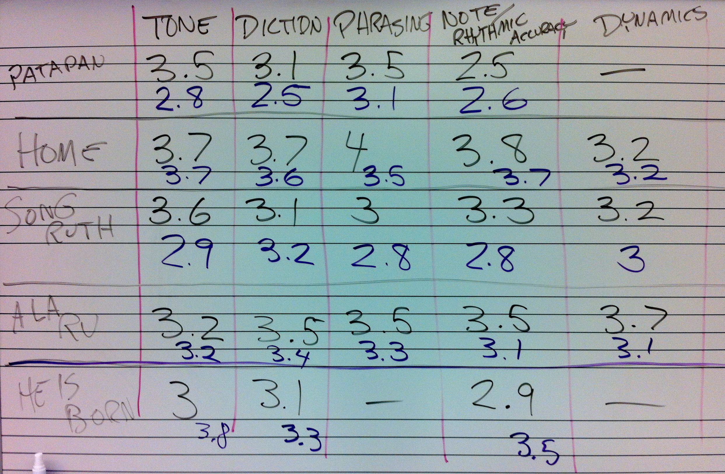 FRESHMAN TREBLE CHOIR. The first observation is that the weakest performance indicators for the first concert (purple numbers) were not the same for each song. Diction was the weakest indicator for Patapan, dynamics for Home, phrasing/note accuracy for Song Of Ruth, etc. This was cool for the singers to see, because as directors we know that each selection has its own unique challenges and needs. The kids could see a visual of that (after all, it was their own scores!). It informed the singers that they couldn’t just concentrate more on one overall indicator, they had to apply unique goals for each song.