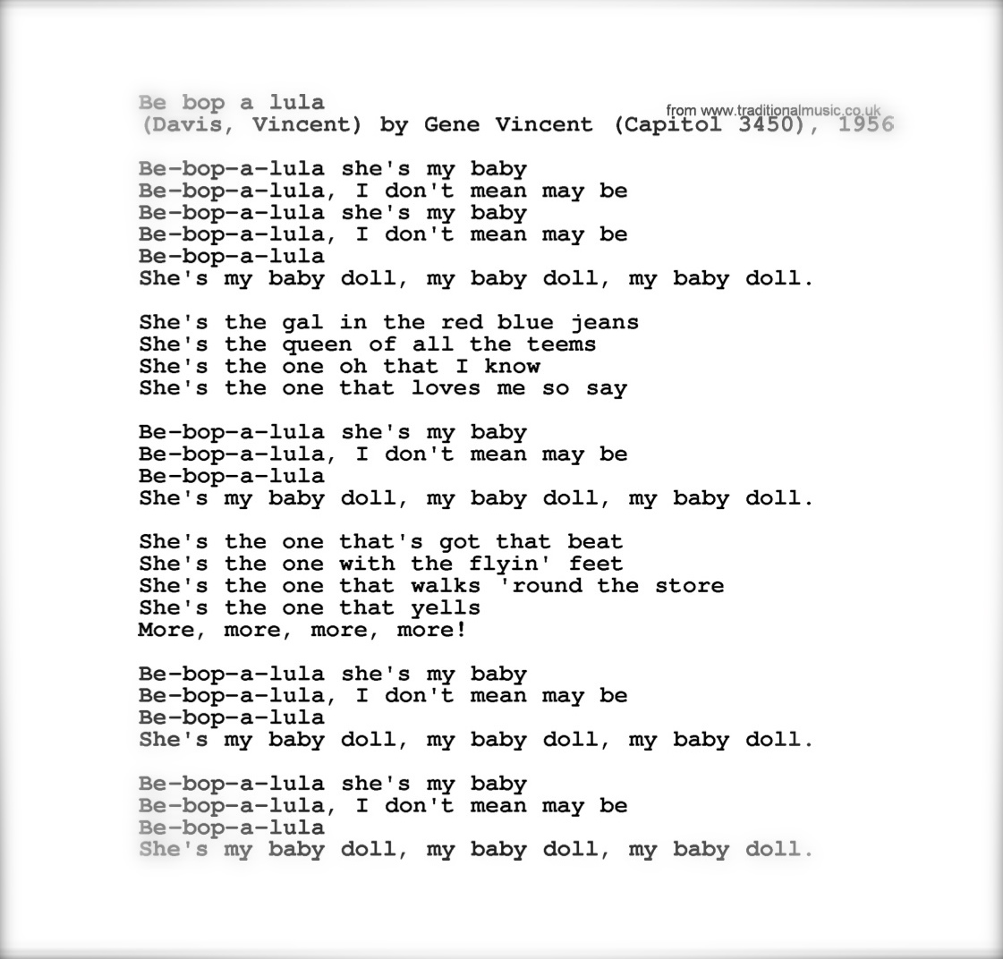 simply by reading it all out loud. Here is a clip of him reading Gene Vincent’s Be-Bop-A-Lula (great old chart btw). Funny stuff in the 1950’s, funny stuff still.
