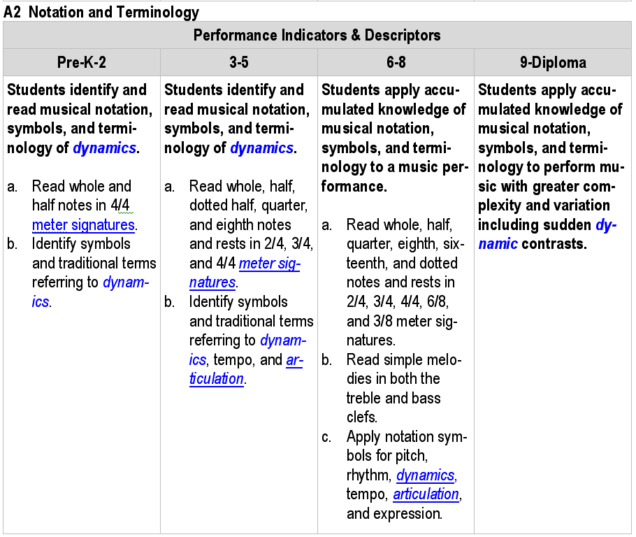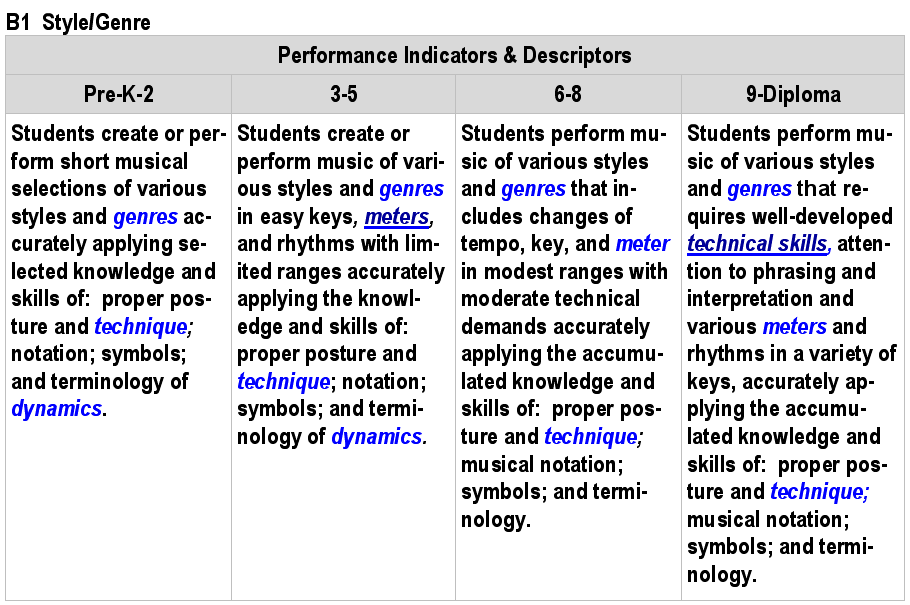 The Maine Learning Results revision from 2007 is a partner document. Not because it was designed that way, but because it addresses student expectations and outcomes as it pertains to music literacy and practice/application. It doesn’t go into the detail of the I Can statements, but does articulate the skills and expectations for students in our music ensembles: